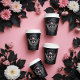 Delicadas y góticas flores de acuarela se unen con adorables tazas de papel perfectas para un fiesta gótico de duchas con temática de Halloween. Nuestros dulces diseños artesanales le darán un toque de elegancia y brillo a la celebración de su ducha de bebé. Eleva tu evento con estas exclusivas tazas de papel que seguro impresionarán a tus invitados. Nuestro diseño presenta nuestras flores góticas de color agua pintadas a mano y manos esqueléticas creando una forma cardíaca con huellas de niña rosa. El diseño captura la esencia de un tema gótico adorable y místico. Diseño original de acuarela dibujada a mano por Moodthology Papery.