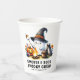Haga graciosas tazas de papel personalizadas para la fiesta de Halloween con el tema del camping con niños con un diseño lindo que presenta un fantasma alegre en un gorra de brujas asando malvaviscos en la fogata. El gráfico está con el dicho "S'more & Boos Spooky Crew". La plantilla facilita el personalizar con el nombre de su familia o cualquier texto para el fiesta exterior no espeluznante con niños.