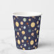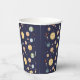 Cute space themed kids birthday paper cups featuring playful astronaut, planet and star illustrations in a seamless pattern on different color backgrounds. You can find more matching items from this collection in our store.