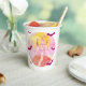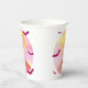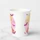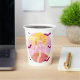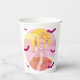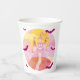 Spooky Castle on Hill Bats Halloween Paper Cups. Castillo espeluznante en la colina y murciélagos voladores. El diseño es de color violeta y naranja.