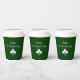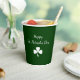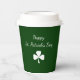 Happy St. Patrick's Day party paper cup, with a cute shamrock design on a green background. With script typography lettering, you can customize with your own text. Great for your St. Patrick's Day party celebration.