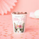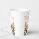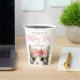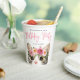 Cuidados tazas de cumpleaños con temática de gato con un guión rosa caprichoso y un gato acuarela pintado con flores rosas y malvas cerca del fondo del diseño. Personalice las copas de cumpleaños con temática de gatitos con el nombre, edad y fecha del chica de cumpleaños. El diseño se repite en la parte posterior.