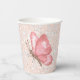 Mariposa rosa pintada sobre una cama de encaje floral y confeti azul.texto Personalizable.