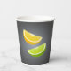 Taza de papel de cítricos con rodajas de limón y lima, sobre fondo gris oscuro