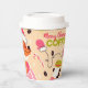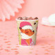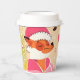 Un vaso de papel con un personaje de zorro rojo en un gorra de Navidades. El zorro está sosteniendo una taza de café. El ilustracion es plano en tonos rosa y verde.