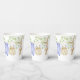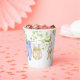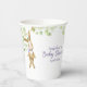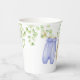 taza de papel para la ducha de bebé, decorada con hermosos ilustraciones acuarelas de ropa linda para bebé colgados en una fila para secarse, un lindo conejito relleno rodeado de ramas delicadas con hojas verde claro.