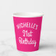 tazas fiestas de papel personalizado rosa 21 de cumpleaños. Suministros de fiesta desechables para la celebración del 21º cumpleaños. Elegante plantilla de tipografía de guión. Añade tu propio nombre personalizado. Color personalizado. Impresión a dos caras.