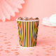 Las franjas brillantes en colores de Halloween de naranja, negro, amarillo-verde y blanco se combinan para hacer una colorida taza de papel. No es tan obviamente Halloween, y podría ser usado todo el año. Perfecto también para el día de Acción de Gracias.