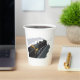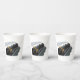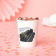 Un tren de vapor negro recorriendo las vías. Este diseño parece realmente efectivo en estas tazas de papel