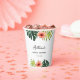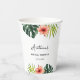 Tazas de papel para despedida de soltera clásicas adornadas con motivos tropicales de acuarela: hoja de monstera, hoja de palma y flor de hibisco. Personalice las tazas con sus detalles para el día de su fiesta. Es simple y el resultado es inmediatamente visible en la pantalla.