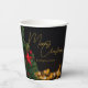 Estos preciosos vasos de papel fiesta de Feliz Navidad presentan un guión moderno escrito a mano en oro sobre luces brillantes al lado de un árbol navideño festivo que está decorado con adornos rojos y verdes. Personalizar esta elegante decoración de celebración de vacaciones con escritura personalizada sobre el cielo negro de la noche.