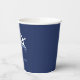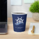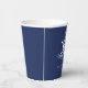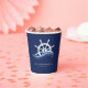 Vasos de papel azules y blancos de tema náutico para despedida de soltera / fiesta de novia con timón de barco y la frase "última vela antes del velo". Personalízalo con los detalles de tu evento.