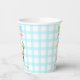 Un tonto tema del primer cumpleaños de un ganso, tazas de papel para fiestas de cumpleaños de niños con una linda gansa de color agua con un gorra fiesta y globos en un suave fondo azul de gingham.