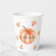 Una pequeña cucharadita de papel color calabaza Halloween Fall Paper Cups, función con la palabra "Nuestra calabaza pequeña" diseño moderno, minimalista calabaza acuática naranja y hojas de otoño, perfecto para Halloween, ducha de bebé caída, se espera bebé en otoño.