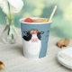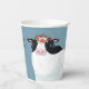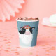 Una vaca feliz sonríe con una nariz suave rosada, cuerpo blanco y negro, con pequeñas amapolas rojas en el cabello, situadas en un fondo azul marino. ¡Estas tazas tienen un lugar donde escribir el nombre del invitado para que las tazas no se mezclen con el fiesta!