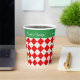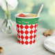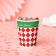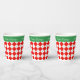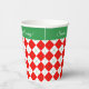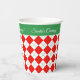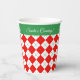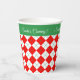 El rojo, el blanco y el verde son ideales para una fiesta de vacaciones. Estas tazas de fiesta de papel se coordinan con las servilletas de papel y las placas tituladas "Trío de renos de Santa". Cambie el texto a sus propias palabras para personalizar su tema fiesta. Una banda verde en la parte superior de la taza acentúa el diseño y es el fondo para el texto, "¡Papá Noel!".