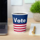Ayuda a sacar el voto en tu comunidad. Esta copa tiene un campo azul en la parte superior con la palabra 'votar' en letras blancas. En la parte de abajo hay rayas rojas y blancas que recuerdan a la bandera estadounidense.