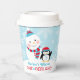 Winter wonderland "ONEderland" diseño de tazas de papel para fiestas de primer cumpleaños con un muñeco de nieve feliz y un pingüino lindo con gorras cálidos y una bufanda y un fondo de invierno con un patrón de copos de nieve. azul hielo, turquesa, rojo y blanco y texto personalizado.