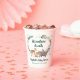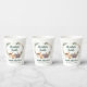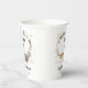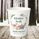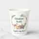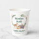 Rústicas tazas de papel de ducha de bebé de invierno con ilustraciones acuáticos de lindos animales de bosque (oso, zorro, ciervo y búho), flores, vegetación y estrellas doradas y copos de nieve. "Adventure Awaits" y el nombre de la futura madre están escritos en un guión verde oscuro del bosque.