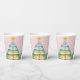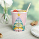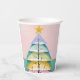 A vibrant, stylized composition depicting a Christmas tree in an abstract, layered landscape. The artwork features a distinct, dark central tree trunk and bare, snow-dusted branches reaching out across horizontal, triangular planes of color. These layers, rendered in soft pastel hues of pink, pale lavender, teal, and gold, suggest snow-covered tiers or an ethereal mountain range. A bright, golden, five-pointed star crowns the apex. The surface has a rich, textural quality, as if painted with thick paste or gouache. Gold accents highlight small, glowing spheres scattered across the branches and within the colorful layers, suggesting festive ornaments or winter light. The overall mood is cheerful, modern, and serene.