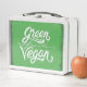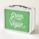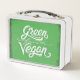 Una lonchera metalizado blanca con un mango negro y un pestillo plateado se muestra sobre un fondo neutro. En la parte delantera de la lonchera hay un panel verde con las palabras "Green Fresh Vegan", escritas en un estilizado y cursivo tipo de letra blanco. El panel verde tiene un aspecto ligeramente angustiado o texturado, con bordes más oscuros que le dan un efecto vintage o tipo pizarra. Las letras blancas están ornamentadas, con flores y remolinos que contribuyen a la atracción visual del diseño. La propia lonchera tiene bordes redondeados y un acabado brillante, reflejando la luz y dándole un aspecto limpio y moderno. La manija está hecha de plástico negro con una empuñadura texturada, y el pestillo plateado es sencillo y funcional. La composición general es limpia y luminosa, con especial atención a la lonchera y su diseño.