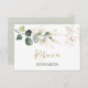 Elegante tarjeta de plaza plana con un ilustracion de follaje verde y dorado en acuarela. En este diseño puede eliminar el texto de ejemplo (tarjeta en blanco). Entonces tendrías que escribir los nombres individuales a mano.