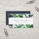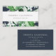Esta tarjeta de negocios azul marino con vegetación es perfecta para un pequeño empresario, consultor, estilista y mucho más. El moderno diseño de boho cuenta con exuberantes hojas de color esmeralda, salvia y verde oliva y productos botánicos con estampados de elegantes flores blancas.