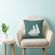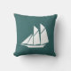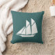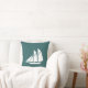 parte de la decoración de temática oceánica barco de vela blanco sobre almohadas azules por un lado y franja azul y blanca por el otro lado.