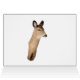 Un ciervo de cola blanca en un campo nevado frente a un arbusto rojo.