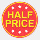 Pegatinas de venta al menudeo con el texto amarillo "Half price" sobre un fondo rojo con estrellas blancas y un círculo amarillo alrededor. Grandes pegatinas de venta para anunciar un descuento del 50%.