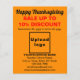 ¡Feliz Día de Acción de Gracias! Festividad para celebrar este noviembre para agradecer por las bendiciones que recibimos. También es una de las vacaciones para promocionar su negocio. Volante de personalizable con la venta de Acción de Gracias, su nombre comercial y otra información de su negocio, un material de marketing que puede utilizar para atraer a más clientes. Personalizar y repártelo para atraer a más clientes a que compren sus productos o clientes para que les gusten sus servicios. Los colores de diseño son textos en negro y rojo sobre fondo de color naranja. Para personalizar de este folleto, especifique el porcentaje de descuento que ofrecerá y las fechas de venta. Sube también el logotipo de tu empresa, escribe tu nombre de negocio, dirección, número de teléfono, correo electrónico y sitio web o tu página de red social de tu empresa. Por favor, compruebe la apariencia en los lados frontal y posterior después de teclear textos y cargar el logotipo. Si la apariencia le resulta agradable, puede realizar su pedido ahora. Si necesita redimensionar y mover los textos y el logotipo para que encajen en este volante o en el tamaño que elija, por favor cambie la herramienta de diseño. También puede cambiar el color de fondo, el color de fuente y el estilo de fuente en la herramienta de diseño. ¡Feliz Día de Acción de Gracias! Te deseo más ventas esta fiesta.