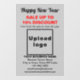 ¡Feliz Año Nuevo! Un nuevo comienzo. Un nuevo inicio. Fiesta para celebrar este enero y también para promocionar tu negocio. Pegatina de ventana personalizable con Venta de Año Nuevo, nombre de tu negocio y otra información. Pegatina de ventana que puedes utilizar como material de marketing para atraer a más clientes. Personalízala y muéstrala para convencer a más clientes de que compren tus productos o a que les gusten tus servicios. Los colores del diseño son textos en negro y rojo sobre fondo gris. Los contenidos son un saludo de Feliz Año Nuevo, textos de venta con porcentaje de descuento que ofrecerás, fechas de la venta, nombre de tu negocio, logotipo, dirección, número de teléfono, correo electrónico y sitio web o página de redes sociales de tu negocio. Por favor, comprueba la apariencia después de subir el logotipo y escribir los textos. Si la apariencia te resulta agradable, puedes hacer tu pedido ahora. Si necesitas cambiar el tamaño y mover el logotipo y los textos para que se ajusten a esta pegatina de ventana o al tamaño y forma que elijas, por favor, cambia en la herramienta de diseño. También puedes cambiar el color de fondo, el color de la fuente y el estilo de fuente en la herramienta de diseño. ¡Feliz Año Nuevo!