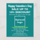 ¡Feliz Día de San Valentín! Una festividad encantadora para celebrar este mes de febrero y para anunciar también su negocio o promocionar su marca. Volante de personalizable con la venta de Valentine, su nombre de negocio y otra información de su negocio, un material de marketing que puede utilizar para atraer a más clientes. Personalizar y repártelo para atraer a más clientes a que compren sus productos o clientes para que les gusten sus servicios. Los colores de diseño son textos en blanco y amarillo-verde sobre fondo verde verde azulado. Para personalizar de este folleto, especifique el porcentaje de descuento que ofrecerá y las fechas de venta. Sube también el logotipo de tu empresa, escribe tu nombre de negocio, dirección, número de teléfono, correo electrónico y sitio web o tu página de red social de tu empresa. Por favor, compruebe la apariencia en los lados frontal y posterior después de teclear textos y cargar el logotipo. Si la apariencia le resulta agradable, puede realizar su pedido ahora. Si necesita redimensionar y mover los textos y el logotipo para que encajen en este volante o en el tamaño que elija, por favor cambie la herramienta de diseño. También puede cambiar el color de fondo, el color de fuente y el estilo de fuente en la herramienta de diseño. ¡Feliz Día de San Valentín! Te deseo más ventas esta fiesta.