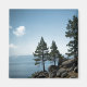 Fotografía de un grupo de pinos en una colina rocosa sobre el lago Tahoe.