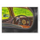 Esta foto del interior clásico de un auto fue tomada a través de la ventana trasera de enrollado hacia abajo.