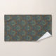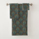 Este juego de toallas de baño tiene un patrón de vieiras en verde aceituna sórdido, roya en azul marino para un aspecto bohemio.