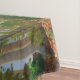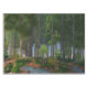 Una mesa de árboles en un soleado día de verano. Los árboles altos son altos y oscuros, pero los saplings de abajo tienen un nuevo y brillante crecimiento. Crecer a través de las hojas caídas es el verde, el rosa y el blanco del trébol y otras cubiertas de tierra.