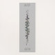 Cada lado de esta alfombra de yoga gris tiene viñas entrelazadas en los colores del verano y el otoño. Verde y púrpura, naranja y oro que representan las estaciones cambiantes con un fondo gris.