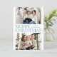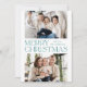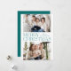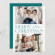Tarjeta fotográfica navideña moderna con "Feliz Navidad" en el centro del diseño con letras verde azuladas de moda con fondo blanco. Personalice la tarjeta de Navidades simples con su nombre de familia y 2 fotos horizontales. La tarjeta se invierte para mostrar un fondo verde azulado con puntos blancos sutiles (nieve).