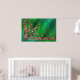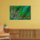 Un trabajo abstracto en verde brillante y cobre. Una joya verde clara está rodeada de hojas de cobre de césped acentuadas con espumosas esmeraldas y estallidos naranjas. Los fractales ondulados, curvados en el fondo aparecen en un fondo verde, marrón y naranja más profundo dentro del filigree de cobre del motivo de la hoja.