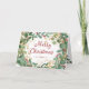Esta elegante tarjeta de Navidad presenta una corona enmarcada de hojas y bayas de acuarela modernas en verde, rojo y dorado con tipografía de letra cursiva roja de moda.