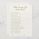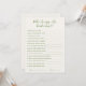 Extraña y caprichosa tarjeta de juego '¿Quién conoce mejor a la novia?' que incluye un tipo de letra verde manuscrita y texto completamente de personalizable. La tarjeta de juego descargable viene en un esquema de color neutro de verde y crudo.