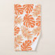 Hojas tropicales verdes y naranjas modernas y toallas de baño monograma. Este magnífico diseño incluye monstera y hojas de palma en verde esmeralda y naranja quemado con contorno de oro. El paño de lavado incluye una hoja naranja y su monograma en un marco verde.
