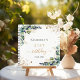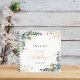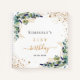 Un color de fondo blanco. Decorada con vegetación eucalipto, follaje dorado y polvo falso purpurina de oro. Añadir un nombre, edad y fecha.