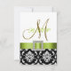 La sofisticada elegancia es transmitida por este hermoso diseño de tarjeta de respuesta para invitación de boda. Un patrón de damasco floral en negro y blanco sirve como fondo para un efecto de foto de la inicial metálica dorada M y una cinta de satén verde lima y un broche de diamantes TODO IMPRESO en una tarjeta plana. Una forma perfecta de hacer que tus invitados respondan a tu invitación de boda. Viene con un sobre blanco en blanco. Patrón de damasco contemporáneo, pero clásico con un diseño que te permite personalizar la parte delantera con tus nombres o el tipo de tarjeta y la parte trasera es libre para agregar tu texto de respuesta de boda personalizado. La tarjeta de respuesta de boda está configurada para la inicial del monograma "M". Para otras letras o colores de cinta o damasco, por favor contacte al diseñador en luxuryweddinginvitations@gmail.com. Diseño de Layout por Elke Clarke©. Gráficos licenciados. Además, el