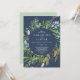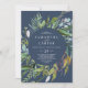 Este verano, la marina de verdor invita a una boda casual, es ideal para un elegante boda de verano. El diseño botánico presenta una disposición exuberante de eucalipto de acuarela pintada, vegetación y hojas verdes con sutiles brotes de flores rosa rubor sobre un fondo azul marino.