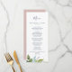 Esta carta boda rosa verde de verano es perfecta para un elegante boda de verano. El diseño botánico presenta una disposición exuberante de eucalipto de acuarela pintada, vegetación y hojas verdes con sutiles brotes de flores rosa rubor. Este menú se puede utilizar para la recepción de bodas, la cena de ensayo o cualquier evento.
