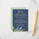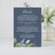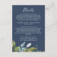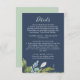 Esta tarjeta de gabinete de detalles de la marina verde de verano es perfecta para un elegante boda de verano. El diseño botánico presenta una disposición exuberante de eucalipto de acuarela pintada, vegetación y hojas verdes con sutiles brotes de flores rosa rubor sobre un fondo azul marino.