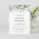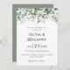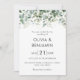Diseño de invitación a la boda, con borde de hojas de vegetación eucalipto, sobre fondo blanco, fácilmente personalizado.