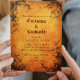 Invitación a la fiesta de Halloween para adultos con disfraces y cócteles. El diseño tiene fondo oscuro, bosques, cráneo oscuro abstracto y murciélagos. Artículos de fiesta de Halloween coincidentes en nuestra tienda. Personaliza tus datos.
